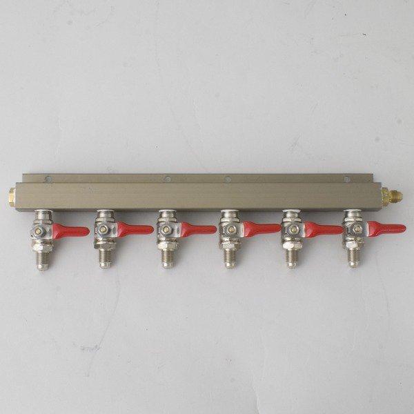 This CO2 manifold comes with six 1/4" MFL shutoff valves and a threaded MFL inlet for flexible installations where the lines can be removed. 1/4" MFL connections work with barbed swivel nuts, so a variety of tubing sizes can be used. Corrosion-resistant nickel-plated brass manifold has shut-off valves with an integral check valve to prevent backflow of gas or liquid.